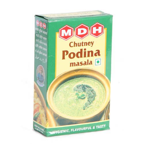 Podina Chutney also known as Mint sauce with hit of spices. In natural yoghurt add Podina Chutney Masala and enjoy variety of snacks like samosas,spring rolls, kebabs etc. You can also sprinkle Podina Chutney Masala on sandwiches, savouries, waffles etc. for a spicy, minty taste.